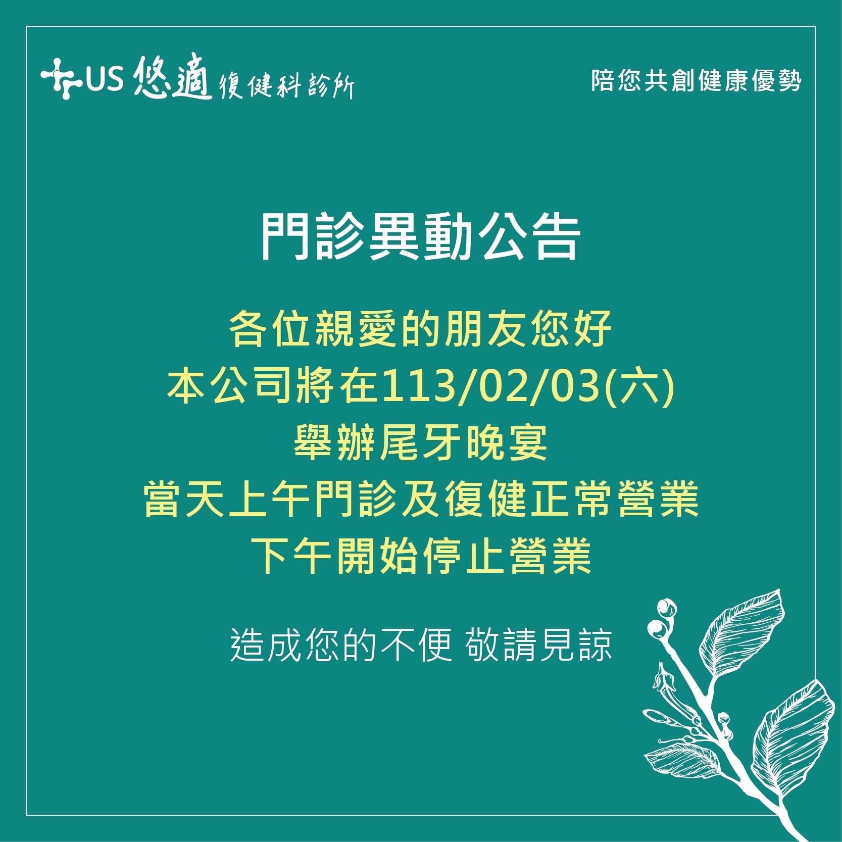 【悠適復健|休診公告】 1 月 29, 2024/在: news /通過: uscare 【悠適復健|休診公告】 本公司將在113/02/03(六) 舉辦尾牙晚宴 當天上午門診及復健正常營業 下午開始停止營業 造成您的不便 敬請見諒 ——————————————– 02-27493088 台北市松山區光復北路11巷65號 https://www.uscare.com.tw/ Line 官方帳號選單預約門診 https://lin.ee/l13YNsF https://www.uscare.com.tw/wp-content/uploads/2024/01/LINE_ALBUM_2月份門診異動_240129_3.jpg 1667 1667 uscare /wp-content/uploads/2018/11/資產-2@3x.png uscare2024-01-29 18:00:402024-01-29 01:46:25【悠適復健|休診公告】