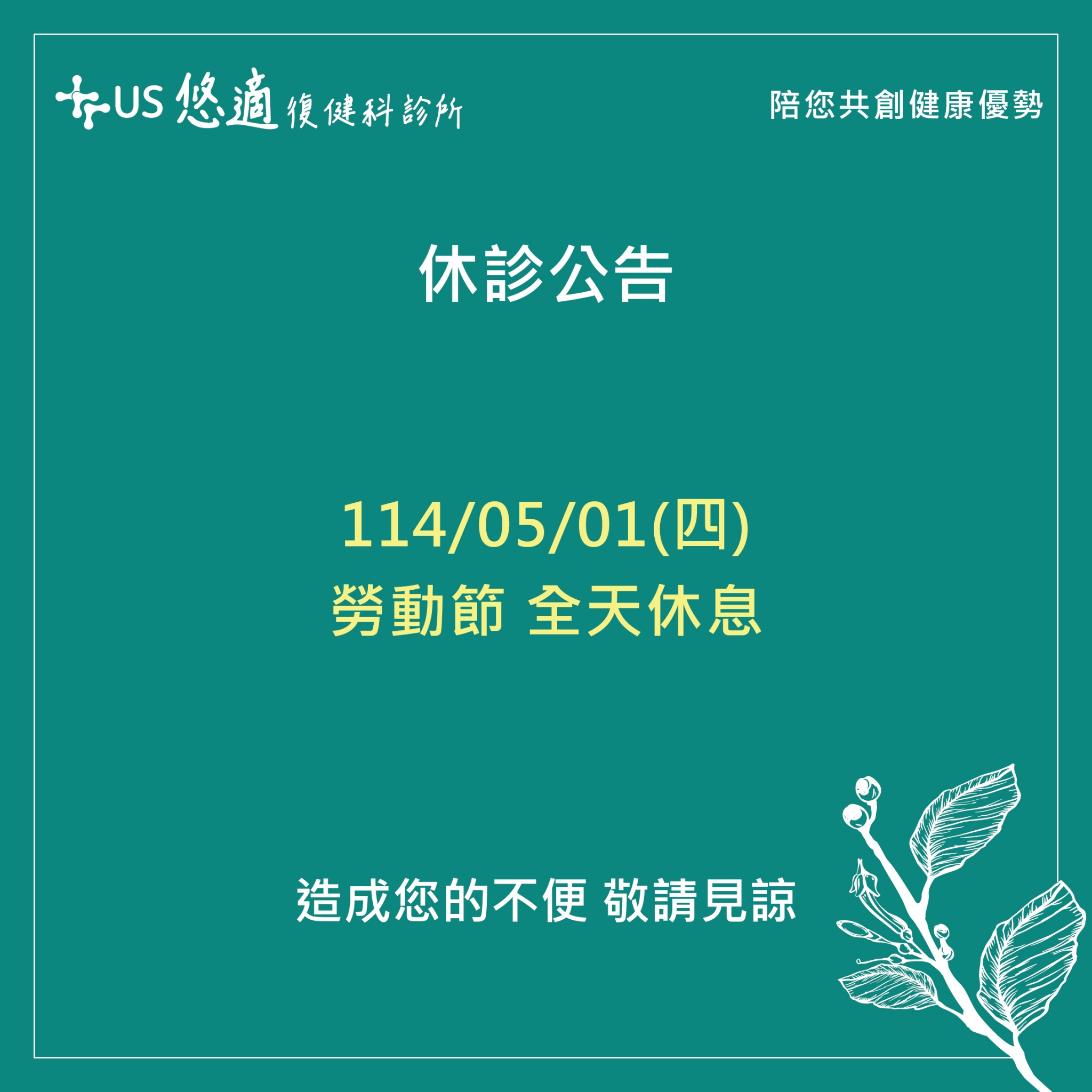 【#悠適復健|2025 勞動節休診公告】 4 月 17, 2025/在: All, news /通過: uscare【#悠適復健|2025 勞動節休診公告】 2025/05/01(四) 勞動節全院休診,復健暫停 造成您的不便,敬請見諒 ———————————————— 悠適復健科診所 台北市松山區光復北路11巷65號 ( 近捷運南京三民站 ) 02-2749-3088 ———————————————— 官方網站 | 最新最完整的資訊 https://www.uscare.com.tw/ 悠適 LINE ID: @979spmjv https://lin.ee/8LbqvoV #悠適復健科診所 悠適陪您共創健康優勢 https://www.uscare.com.tw/wp-content/uploads/2025/04/LINE_ALBUM_2025.05門診異動_250417_2.jpg 2048 2048 uscare /wp-content/uploads/2018/11/資產-2@3x.png uscare2025-04-17 03:40:442025-04-17 03:40:44【#悠適復健|2025 勞動節休診公告】