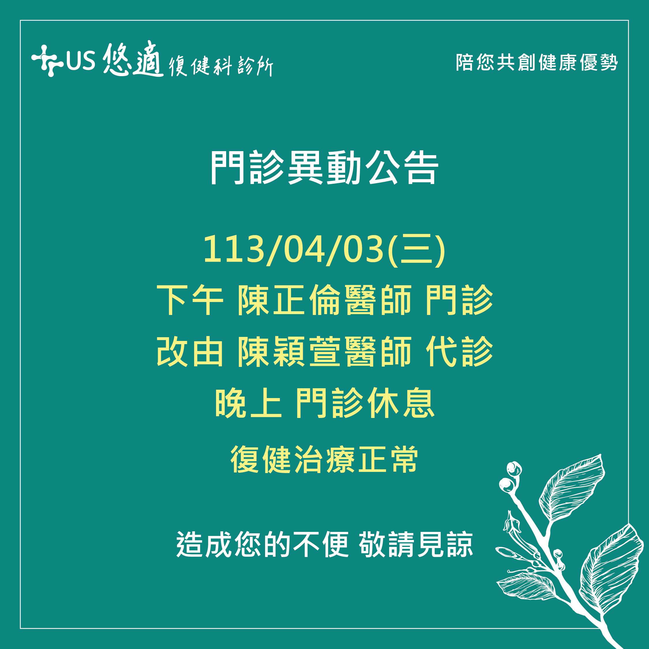 📣【悠適復健|113/04/03門診異動公告】 4 月 1, 2024/在: All, news /通過: uscare 113/04/03(三) 下午 #陳正倫醫師 門診 改由 #陳穎萱醫師 代診 晚上 門診休息 復健治療正常 造成您的不便 敬請見諒 ——————————————— 02-27493088 台北市松山區光復北路11巷65號 https://www.uscare.com.tw/ Line 官方帳號選單預約門診 https://lin.ee/l13YNsF #悠適復健科診所 #悠適陪您共創健康優勢 https://www.uscare.com.tw/wp-content/uploads/2024/04/悠適_門診異動公告_4月_2.jpg 2250 2250 uscare /wp-content/uploads/2018/11/資產-2@3x.png uscare2024-04-01 08:48:332024-04-23 03:19:39📣【悠適復健|113/04/03門診異動公告】