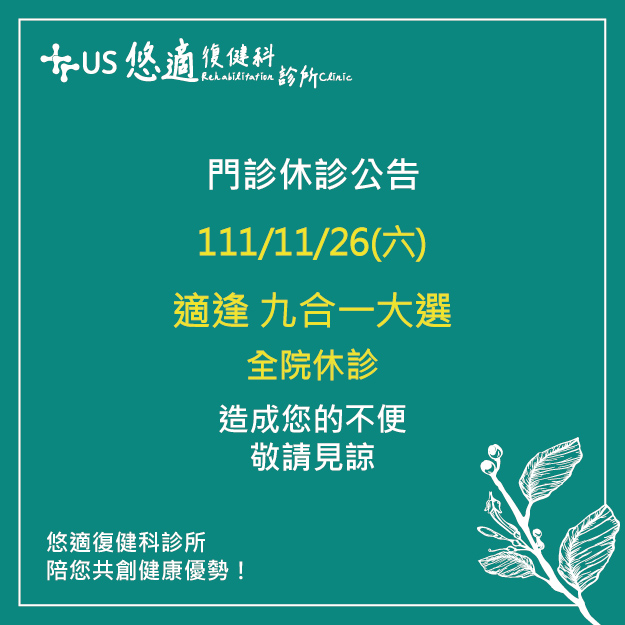 【松山悠適|2022選舉投票日休診公告🗳】 11 月 18, 2022/在: news /通過: uscare📌2022/11/26 (六) 適逢九合一選舉🗳🏃🏃 悠適復健科診所 全院休診 造成您的不便 敬請見諒🙇♂️🙇 ——————————————— #悠適復健科診所 #悠適陪您共創健康優勢 ☎02-27493088 🏠台北市松山區光復北路11巷65號 🌐https://www.uscare.com.tw/ Line 官方帳號選單預約門診 https://lin.ee/l13YNsF https://www.uscare.com.tw/wp-content/uploads/2022/11/112602-01.jpg 625 625 uscare /wp-content/uploads/2018/11/資產-2@3x.png uscare2022-11-18 01:20:372022-11-18 01:20:37【松山悠適|2022選舉投票日休診公告🗳】