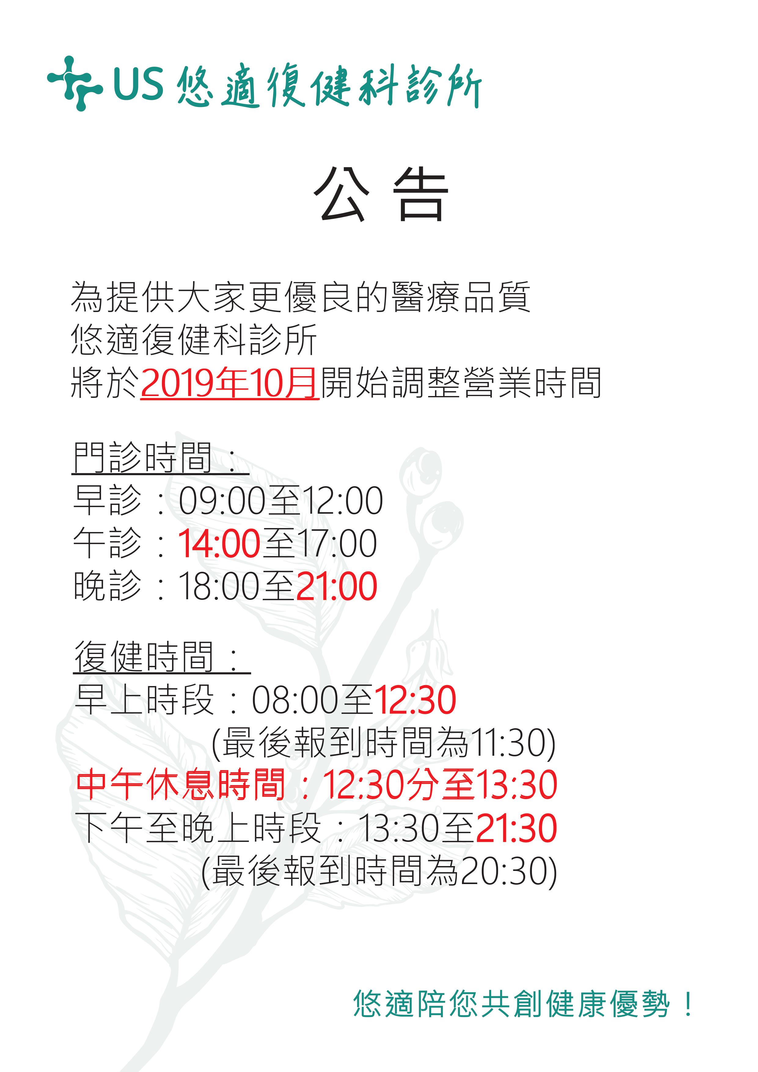 將於【2019年10月】開始調整營業時間