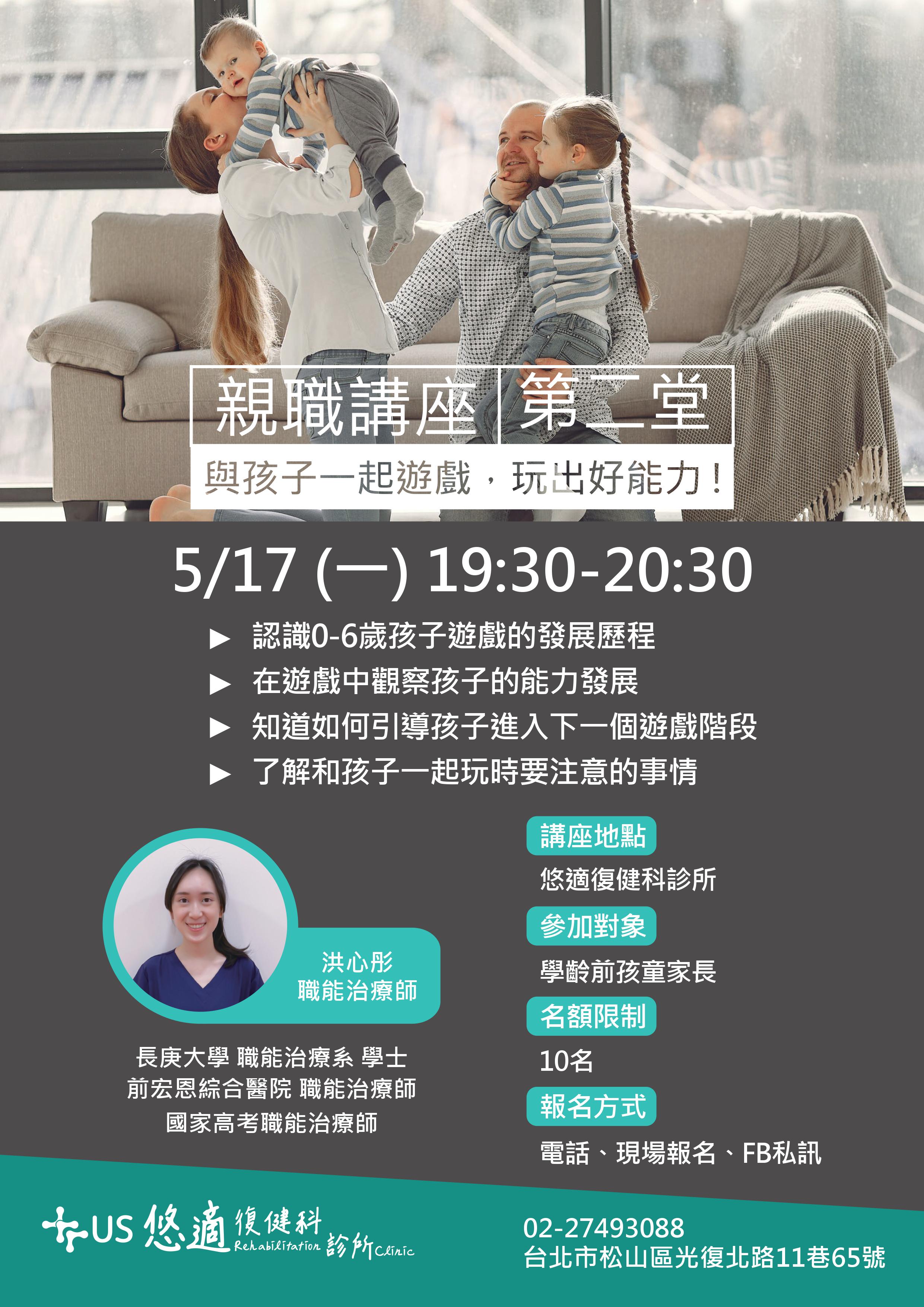 【早療親職講座|與孩子一起遊戲,玩出好能力】 5 月 6, 2021/在: news /通過: uscare 我的孩子怎麼都不和別人一起玩 他怎麼都只喜歡把東西丟掉 現在應該要帶他玩扮家家酒了嗎 怎麼遊戲規則講了那麼久都還聽不懂 對孩子來說 「玩」是很重要的職能 孩子在遊戲中 #探索世界 #與環境互動。 在遊戲中可以促進動作、認知、語言的發展 也能練習如何和其他玩伴有好的社交互動喔 講師:洪心彤 職能治療師 時間:2021/05/17 (一) 19:30-20:30 地點:悠適復健科診所 兒童早療發展中心 對象:家中有6歲以下孩童之家長 名額:10名 如何報名:現場報名、來電報名、FB私訊 ——————————————— #悠適復健科診所 #悠適陪您共創健康優勢 02-27493088 台北市松山區光復北路11巷65號 Line 官方帳號選單預約門診 https://lin.ee/l13YNsF https://www.uscare.com.tw/wp-content/uploads/2021/05/0001-1.jpg 3508 2481 uscare /wp-content/uploads/2018/11/資產-2@3x.png uscare2021-05-06 10:58:422021-06-16 10:27:04【早療親職講座|與孩子一起遊戲,玩出好能力】