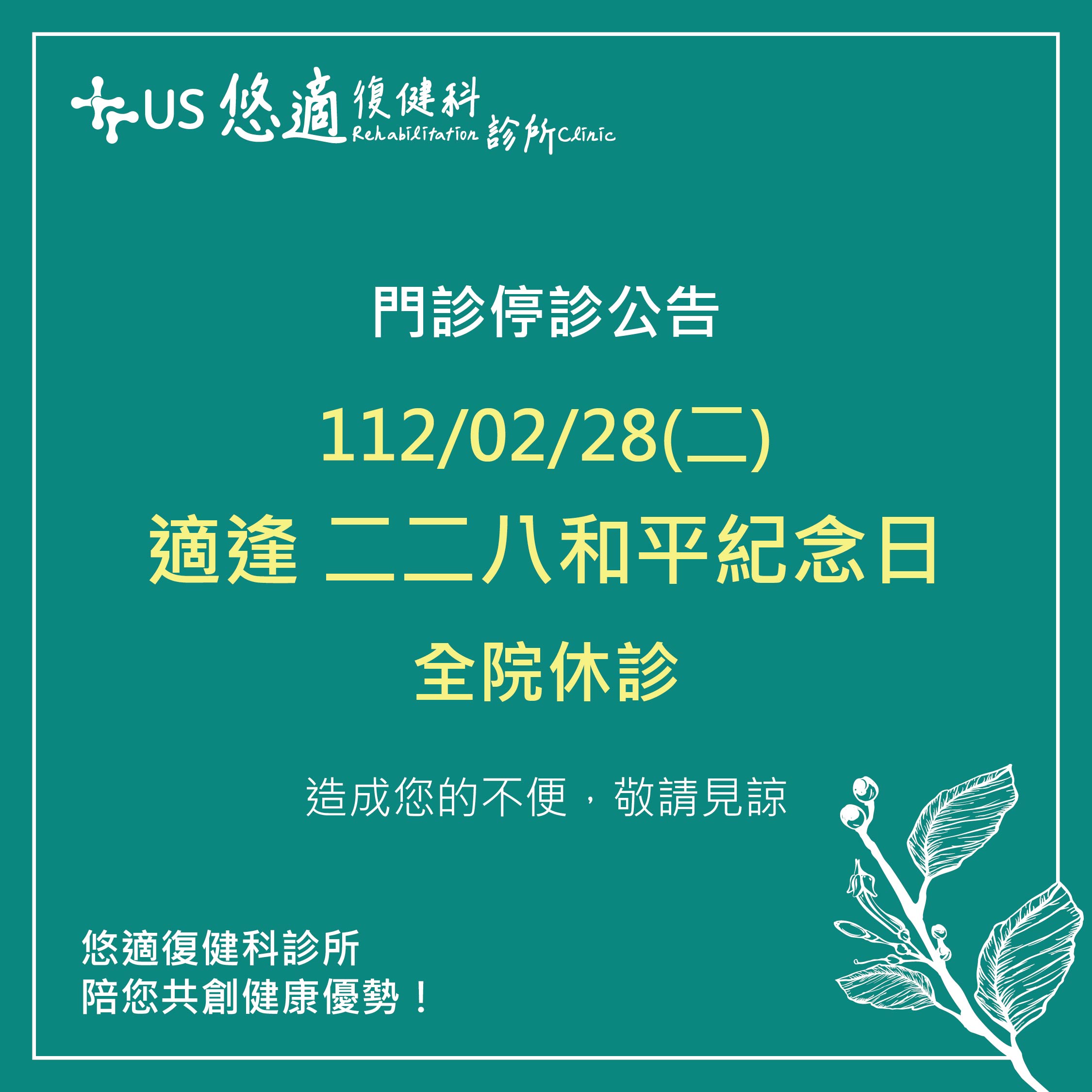 【松山悠適|二二八和平紀念日休診公告❤️】 2 月 20, 2023/在: news /通過: uscare📌2023/02/28 (二) 適逢二二八和平紀念日 全院休診 造成您的不便 敬請見諒🙇♀️🙇 ——————————————— 02-27493088 台北市松山區光復北路11巷65號 https://www.uscare.com.tw/ Line 官方帳號選單預約門診 https://lin.ee/l13YNsF #悠適復健科診所 #悠適陪您共創健康優勢 https://www.uscare.com.tw/wp-content/uploads/2023/02/0228-02.jpg 2250 2250 uscare /wp-content/uploads/2018/11/資產-2@3x.png uscare2023-02-20 01:26:492023-02-20 01:26:49【松山悠適|二二八和平紀念日休診公告❤️】