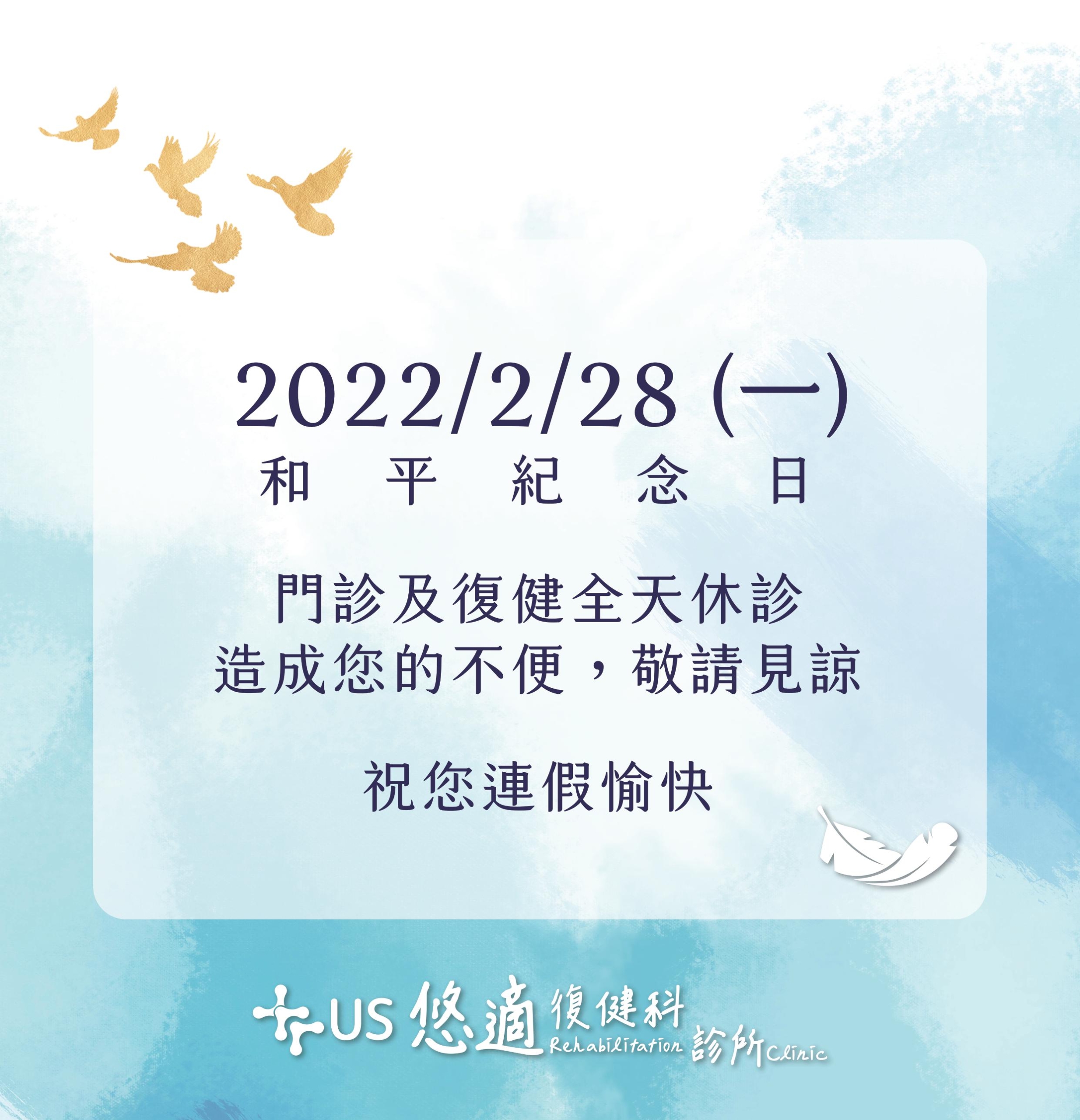 【松山悠適|228連假門診休診公告】 2 月 21, 2022/0 評論/在: news /通過: uscare2022/02/28(一) 全天休診一次 造成您的不便 敬請見諒 悠適復健科診所祝您連假愉快 ——————————————— #悠適復健科診所 #悠適陪您共創健康優勢 02-27493088 台北市松山區光復北路11巷65號 https://www.uscare.com.tw/ Line 官方帳號選單預約門診 https://lin.ee/l13YNsF https://www.uscare.com.tw/wp-content/uploads/2022/02/39209e8e65084ddca284d7abed16271c-0002-scaled.jpg 2560 2468 uscare /wp-content/uploads/2018/11/資產-2@3x.png uscare2022-02-21 11:52:062022-02-21 11:52:06【松山悠適|228連假門診休診公告】