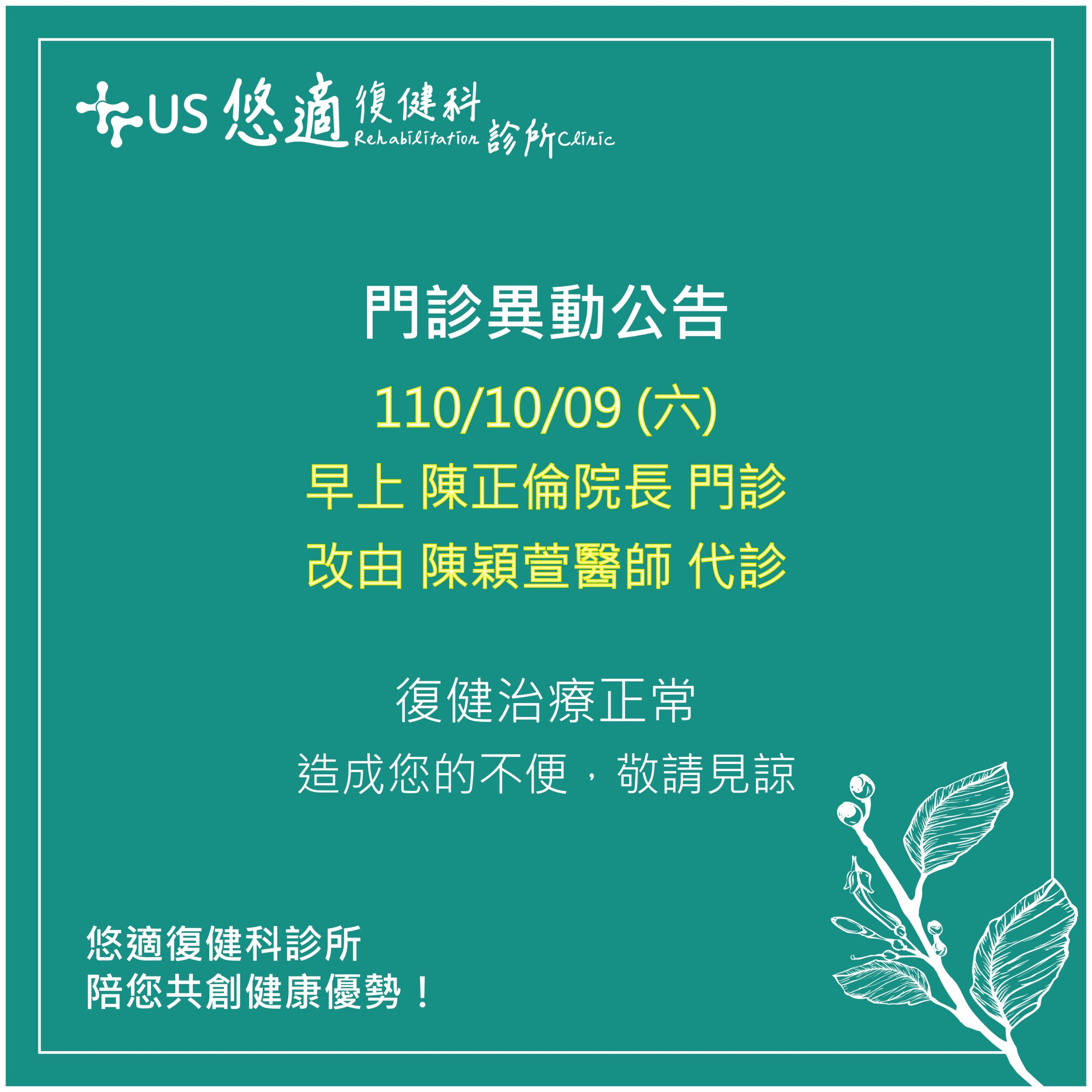 【10/9(六) 門診代診公告】 10 月 2, 2021/0 評論/在: news /通過: uscare 110/10/09(六) 早上 #陳正倫院長 門診 改由 #陳穎萱醫師 代診 造成您的不便 敬請見諒 ——————————————— #悠適復健科診所 #悠適陪您共創健康優勢 02-27493088 台北市松山區光復北路11巷65號 Line 官方帳號選單預約門診 https://lin.ee/l13YNsF https://www.uscare.com.tw/wp-content/uploads/2021/10/d4e9606a65244fbcb251298b9be46c8a-0001-scaled.jpg 2560 2560 uscare /wp-content/uploads/2018/11/資產-2@3x.png uscare2021-10-02 10:01:352021-10-02 10:01:35【10/9(六) 門診代診公告】