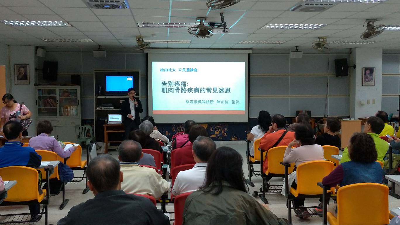 陳正倫醫師受邀台北市松山社區大學演講 11 月 30, 2018/在: news /通過: morcept10/29陳正倫院長很榮幸受邀至松山社大演講,與許多學員們分享「告別疼痛:肌肉骨骼疾病的常見迷思」,現場反應熱烈,大家都很好學,很感謝大家的熱情參與。 https://www.uscare.com.tw/wp-content/uploads/2018/11/最新公告.jpg 771 1368 morcept /wp-content/uploads/2018/11/資產-2@3x.png morcept2018-11-30 04:55:202019-05-09 05:12:52陳正倫醫師受邀台北市松山社區大學演講