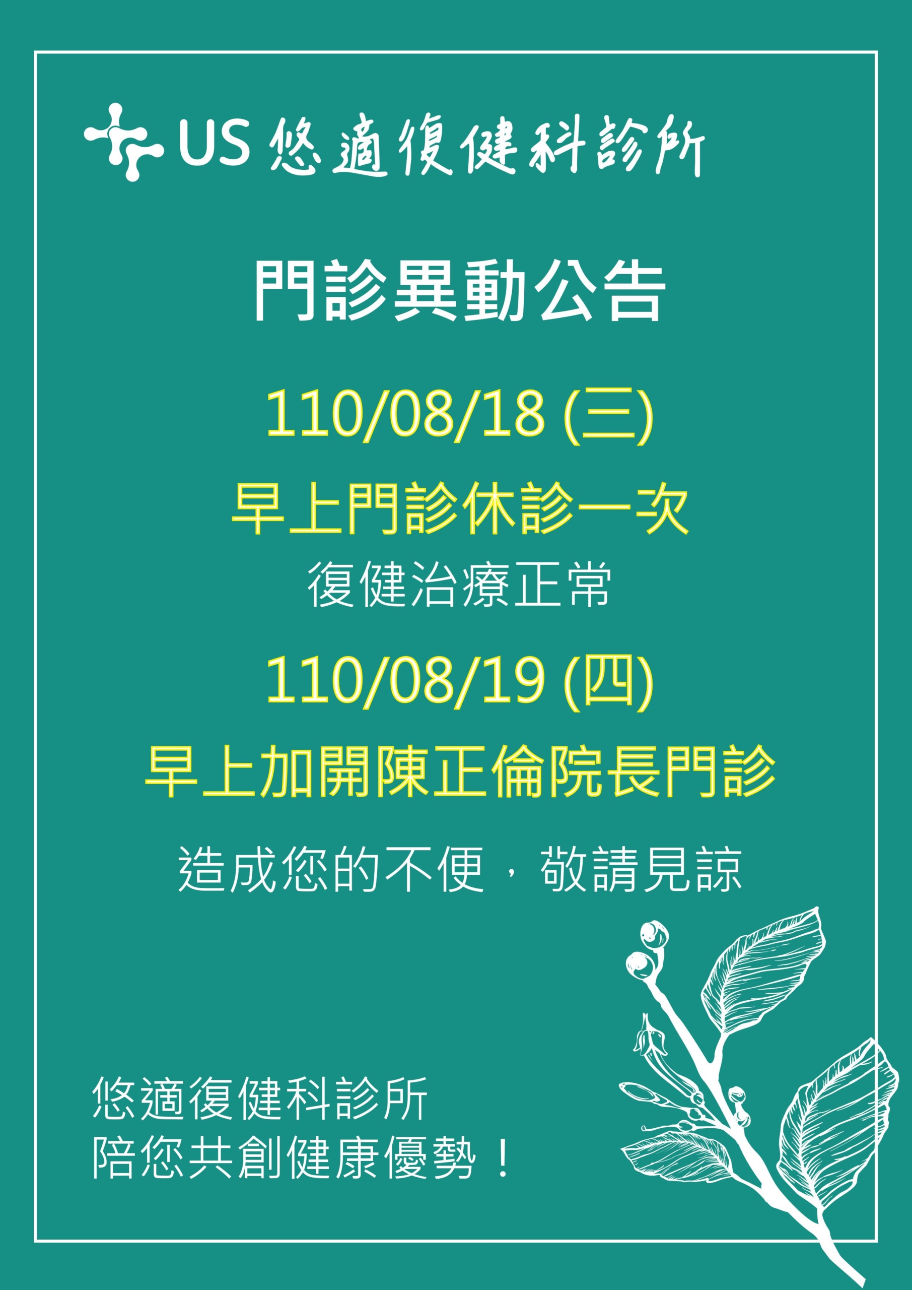 2021/08/18及2021/08/19門診異動公告 8 月 11, 2021/0 評論/在: news /通過: uscare 【#松山悠適|門診異動公告】 110/8/18(三) 早上 #陳正倫院長門診 暫停一次 復健治療正常 110/8/19(四) 早上加開 陳正倫院長 門診 造成您的不便 敬請見諒 ——————————————— #悠適復健科診所 #悠適陪您共創健康優勢 02-27493088 台北市松山區光復北路11巷65號 Line 官方帳號選單預約門診 https://lin.ee/l13YNsF https://www.uscare.com.tw/wp-content/uploads/2021/08/2c06dea62c9c47669f559d570f45badb-0001-scaled.jpg 2560 1811 uscare /wp-content/uploads/2018/11/資產-2@3x.png uscare2021-08-11 11:13:252021-08-11 11:13:252021/08/18及2021/08/19門診異動公告