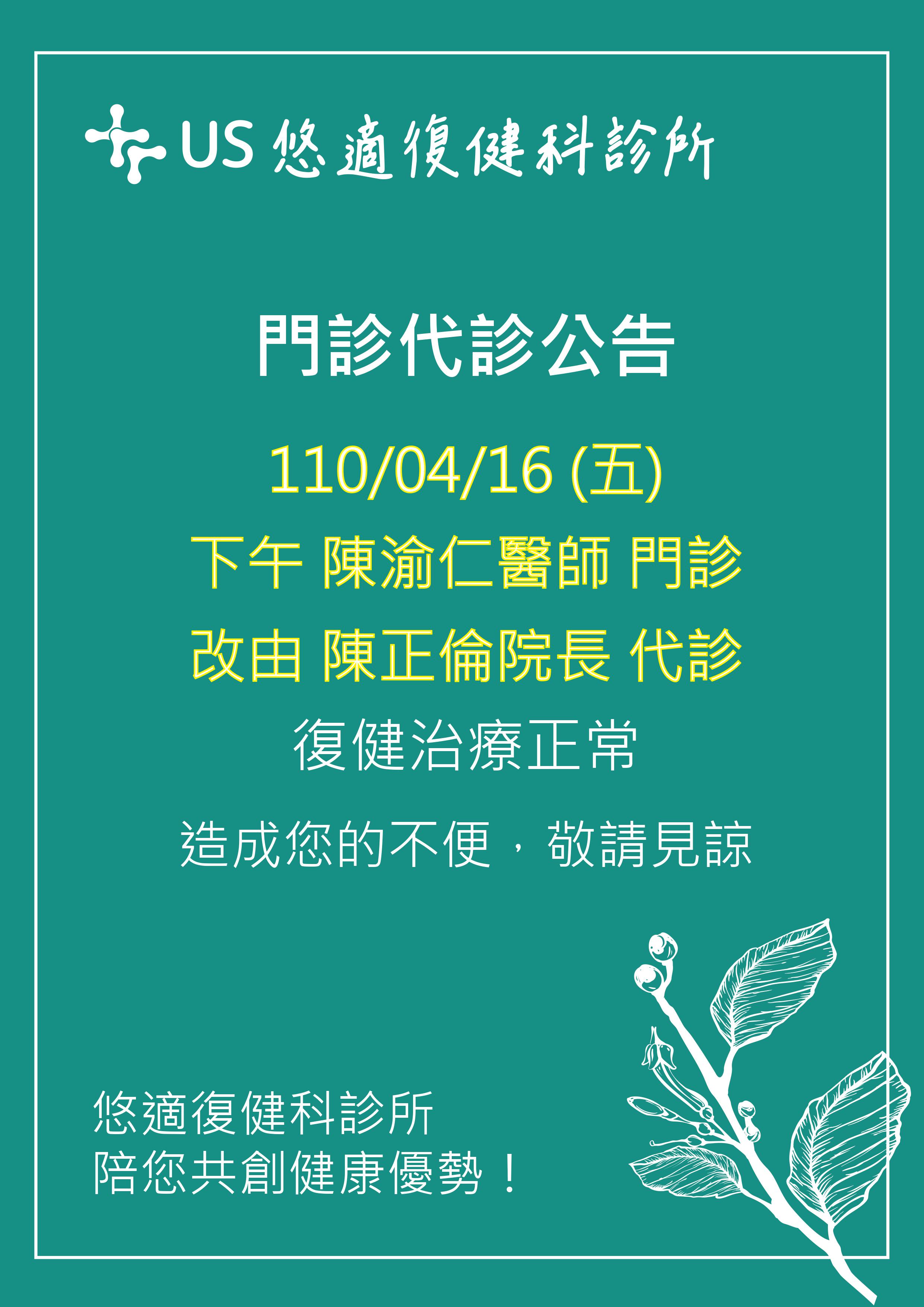 4/16(五)門診代診公告 4 月 14, 2021/在: news /通過: uscare 【#悠適復健|門診代診公告】 110/04/16 (五) 下午 #陳渝仁醫師 門診 改由 #陳正倫院長 代診 復健治療正常 造成您的不便 敬請見諒 ——————————————— #悠適復健科診所 #悠適陪您共創健康優勢 02-27493088 台北市松山區光復北路11巷65號 https://www.uscare.com.tw/ 全新Line官方帳號與功能 | 透過Line 選單預約門診 https://lin.ee/l13YNsF https://www.uscare.com.tw/wp-content/uploads/2021/04/0001-13.jpg 3508 2481 uscare /wp-content/uploads/2018/11/資產-2@3x.png uscare2021-04-14 09:26:582021-06-16 10:27:044/16(五)門診代診公告