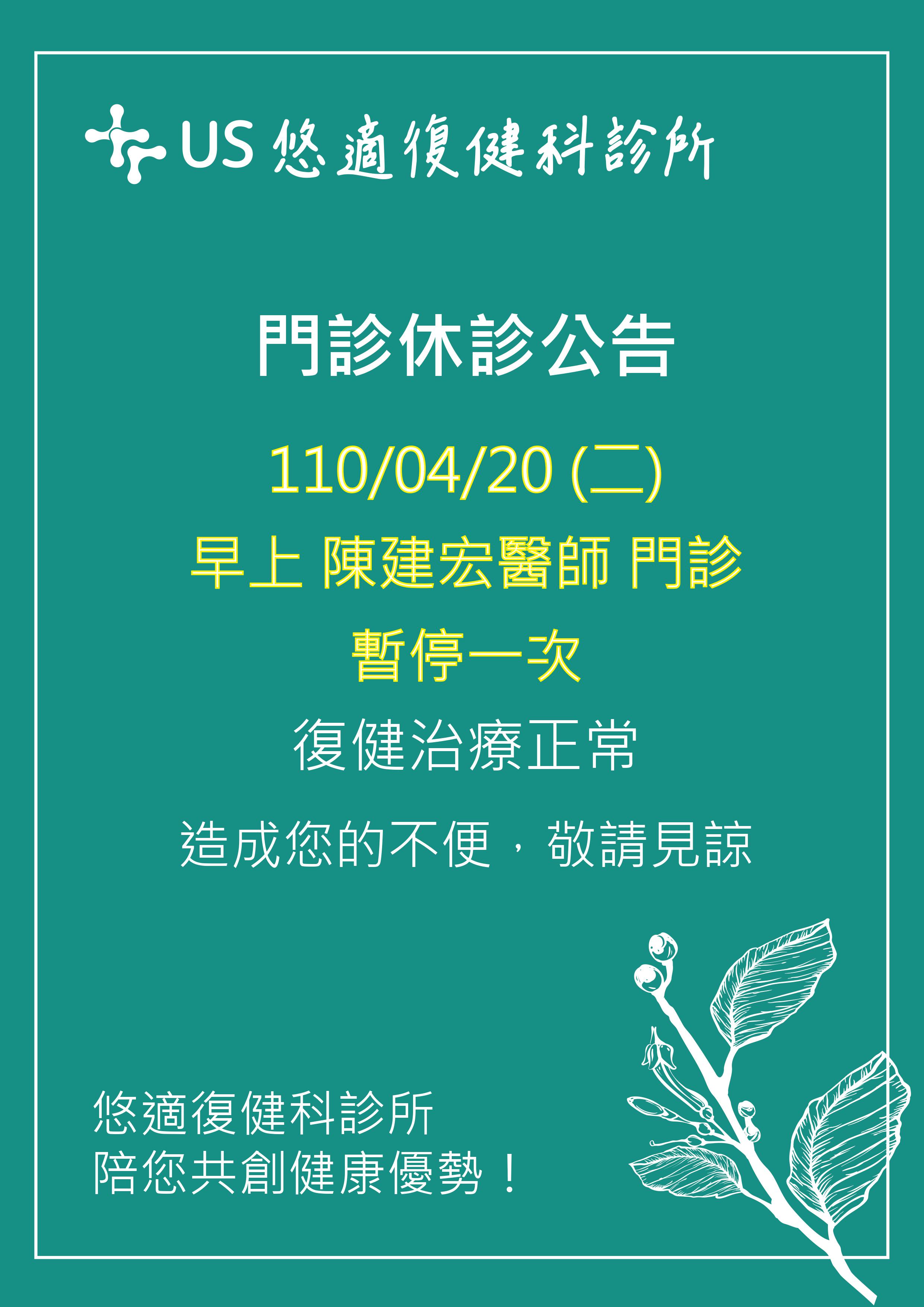 4/20(二)門診休診公告 4 月 15, 2021/在: news /通過: uscare 110/04/20 (二) 早上 #陳建宏醫師 門診 暫停一次 復健治療正常 造成您的不便 敬請見諒 ——————————————— #悠適復健科診所 #悠適陪您共創健康優勢 02-27493088 台北市松山區光復北路11巷65號 https://www.uscare.com.tw/ 全新Line官方帳號與功能 | 透過Line 選單預約門診 https://lin.ee/l13YNsF https://www.uscare.com.tw/wp-content/uploads/2021/04/0001-12.jpg 3508 2481 uscare /wp-content/uploads/2018/11/資產-2@3x.png uscare2021-04-15 09:42:242021-06-16 10:27:044/20(二)門診休診公告
